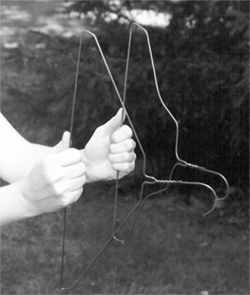 Dowsing rods are used in pairs, and are easy to make. First, cut the hooked part off a wire coat-hanger, then cut the remaining metal in two and straighten it out, and finally make a bend of 90 degrees about a third of the length from one end of each rod. As an alternative you can buy short metal rods from plumbing or welding suppliers (bronze is good); these are often easier to cut and bend into shape. You may find it useful to put the shorter end into a free-flowing handle such as a piece of bamboo, or the plastic cover from an old ball-point pen, or better still short lengths of quarter-inch copper tubing. However, it is just as effective if you hold the metal in your hands, but you do have to hold it loosely, because if you grip it tightly it can’t move. If you prefer, you can just use a pair of coat-hangers without making them into rods. By holding the straight sides in each hand with the hooks facing away from you, the hooks can swing back and forth, although they don’t seem to provide quite the same sensitivity as rods, as they are a bit more limited in movement.