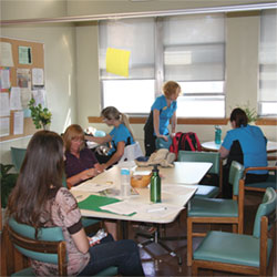 Cecile giving Reiki to Debbie. During low activity times the volunteer staff often give each other sessions.Reiki is definitely the most common healing and stress-reducing modality offered in the Rainbow Room. Other modalities currently offered include Healing Touch, Reflexology, Quantum Touch, Remedial and Relaxation Massage, Far-infrared Dome and Chi Machine, Brennan Healing Science, and others, depending on the volunteer practitioners. Hospital staff come over during their scheduled work breaks. The individual treatment sessions typically run from 15 to 20 minutes. The program runs on Tuesdays from 11 AM to 3 PM and Thursdays from 11 AM to 4 PM for massage therapy. There is one rule we want everyone to follow while in the Rainbow Room: speak only in soft whispers.