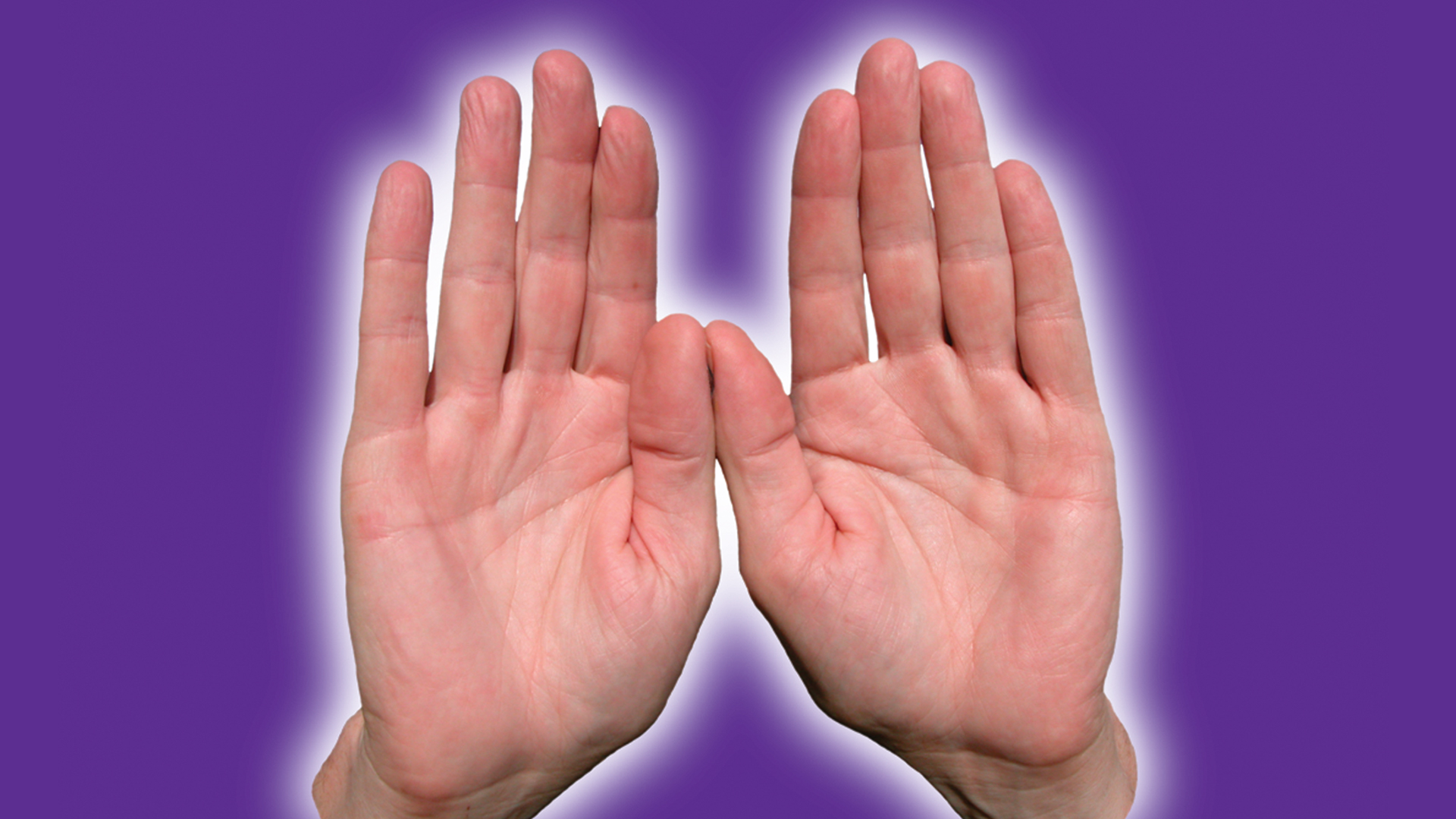 Two open hands held upright side by side with palms facing forward against a purple background.Healing Hands